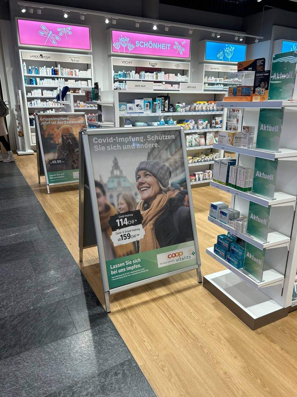 Das Werbeplakat in der Coop Vitality Apotheke, Wankdorf Center