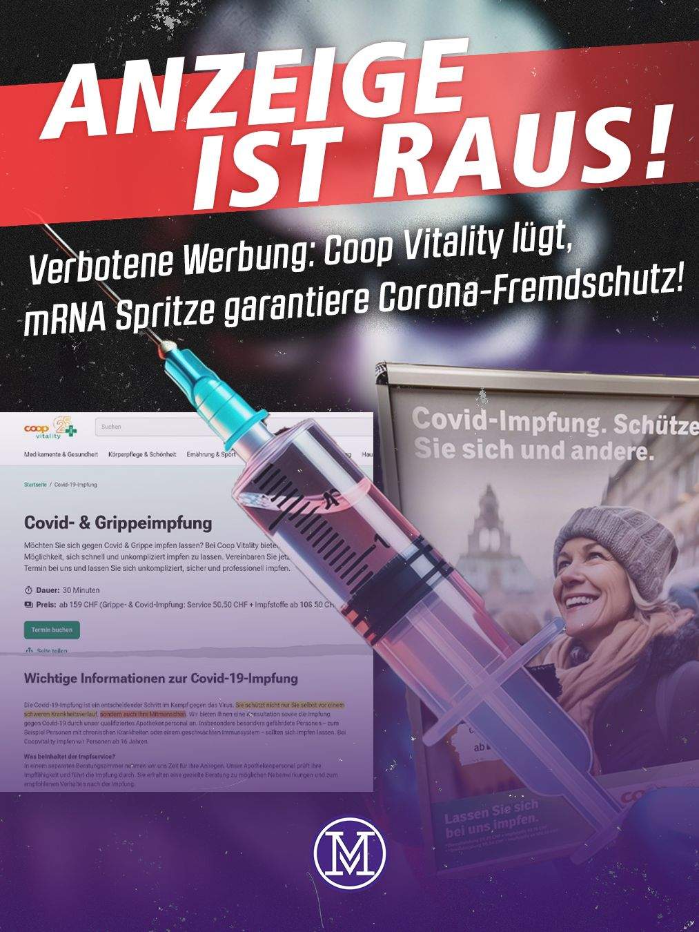 Im Herbst 2025 fiel mir in einer Coop Vitality Apotheke in Bern eine laufende Werbekampagne für COVID-19-mRNA-Impfstoffe auf. Der zentrale Slogan „Schützen Sie sich und andere“ wurde prominent eingesetzt – eine Formulierung, die nach meiner Einschätzung wissenschaftlich nicht mehr haltbar war und den Tatbestand irreführender Heilmittelwerbung (§ 32 HMG) erfüllen könnte.