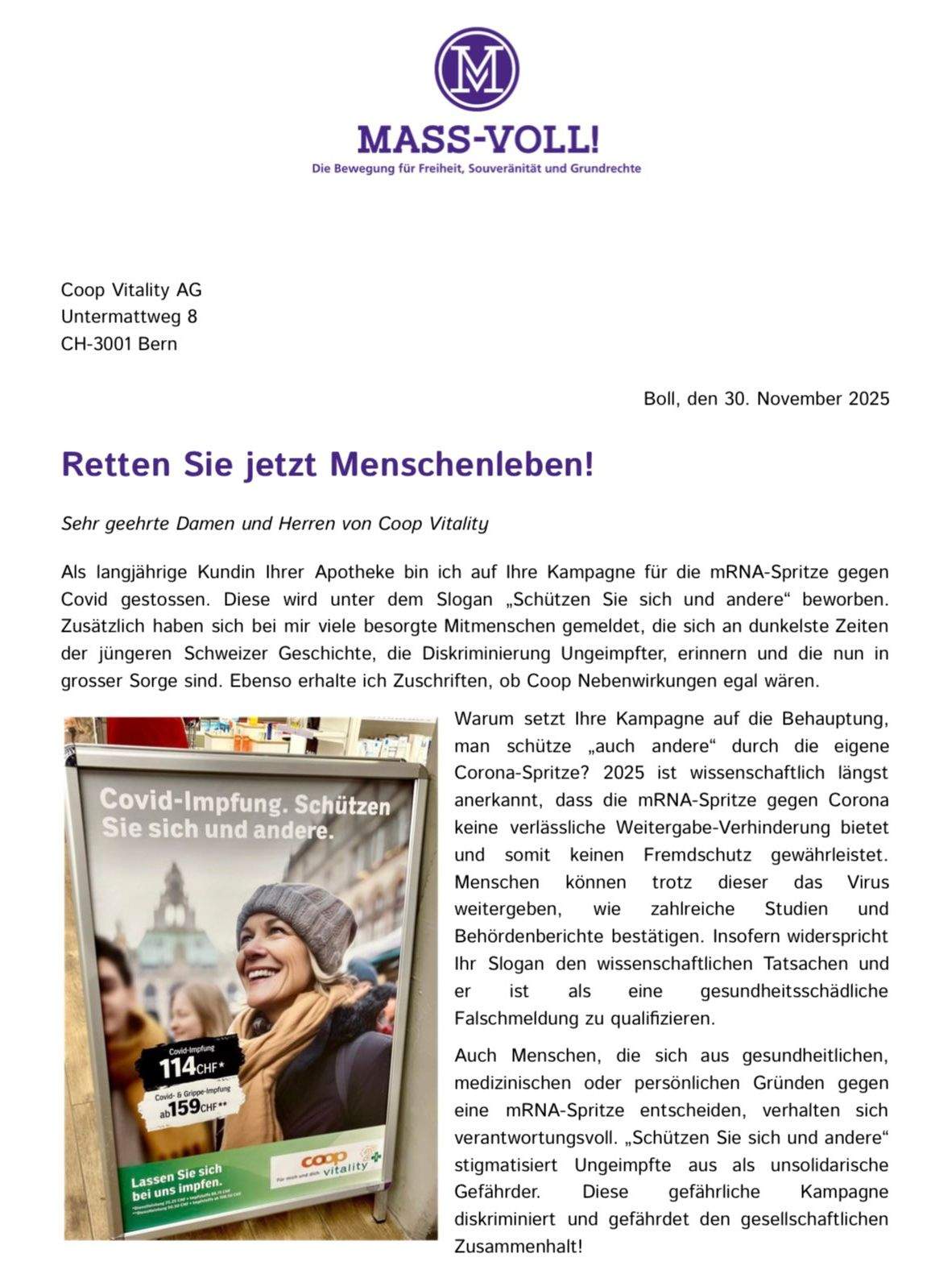 Auf Basis der öffentlichen Kritik verfasste ich - als Präsidentin MASS-VOLL! Bern einen offenen Brief an Coop Vitality. Darin forderte ich: