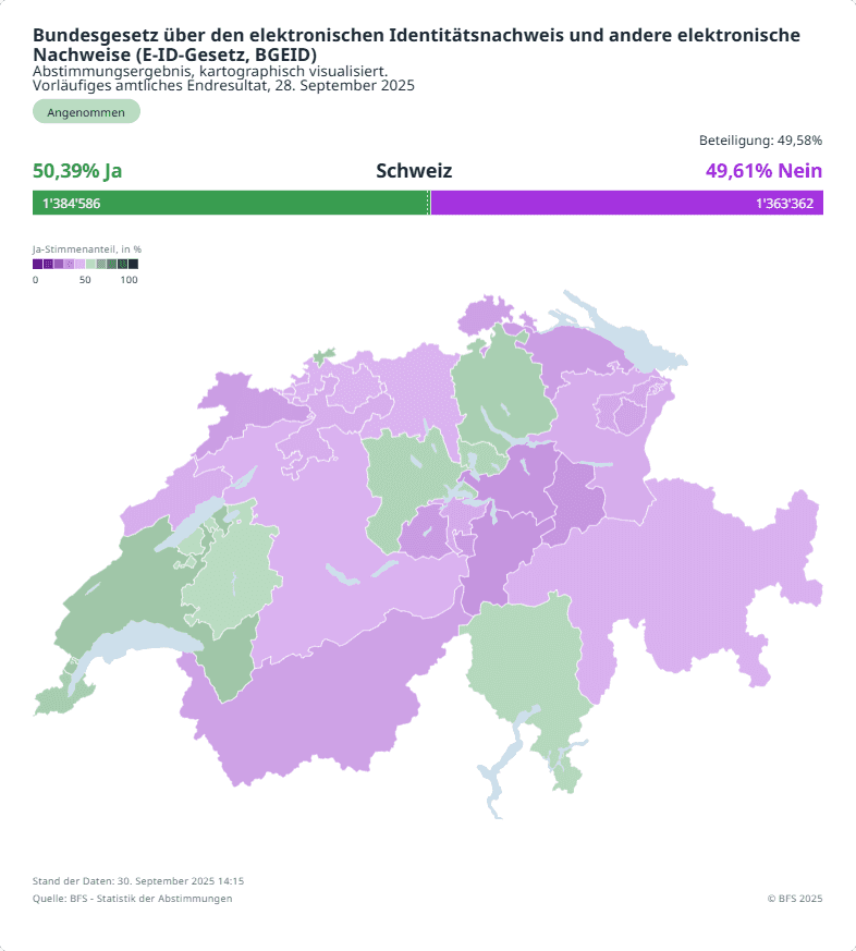 Die eidgenössische Abstimmung vom 28. September 2025 über das Bundesgesetz über den elektronischen Identitätsnachweis (E-ID-Gesetz) endete äusserst knapp – ein wahres politisches Krimi-Finale. Mit 50,39 % Ja-Stimmen gegenüber 49,61 % Nein-Stimmen wurde das Gesetz nur hauchdünn angenommen. Besonders auffällig war die starke urbane Unterstützung in Städten wie Zürich, Basel und Lausanne, während ländliche Regionen mehrheitlich ablehnten. Bereits kurz nach der Auszählung mehrten sich Stimmen, die auf Unregelmässigkeiten, massive Werbeeinflüsse und mögliche Verletzungen der Abstimmungsfreiheit hinwiesen. Das Resultat spaltete das Land – und wurde zum Ausgangspunkt einer juristischen und politischen Aufarbeitung, wie sie die Schweiz seit Jahren nicht erlebt hat.