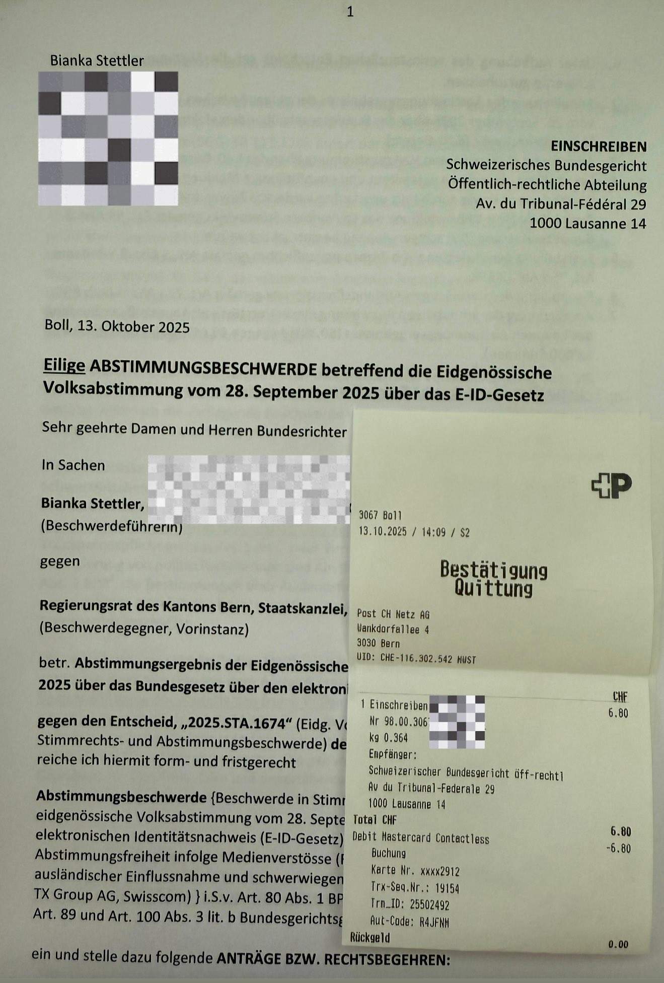 Da Stimmrechtsbeschwerden nur innerhalb weniger Tage nach Bekanntgabe des Abstimmungsergebnisses möglich sind, habe ich die neuen Erkenntnisse umgehend in meine laufende Beschwerde integriert. Nachdem die erste Instanz die Eingabe aus Kompetenzgründen abgewiesen hatte, reichte ich am 13. Oktober 2025 fristgerecht eine Abstimmungsbeschwerde beim Bundesgericht ein.